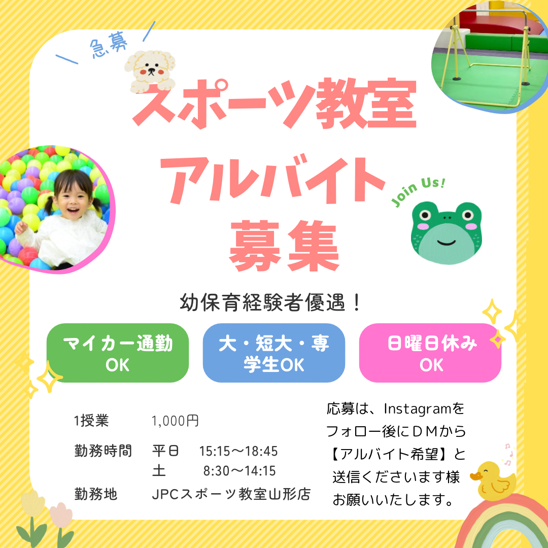 9月29日(日)JPCスポーツ教室山形店でアスレチックパークを開催します✨ 有資格トレーナーがスポーツの楽しさをお伝えします。 見学だけでもOK! 運動のお悩み相談もOK! ご予約不要です!お気軽にお...