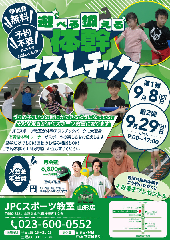 9月8日(日)、9月29日(日)JPCスポーツ教室山形店でアスレチックパークを開催します✨ 有資格トレーナーがスポーツの楽しさをお伝えします。 見学だけでもOK! 運動のお悩み相談もOK! ご予約不要...