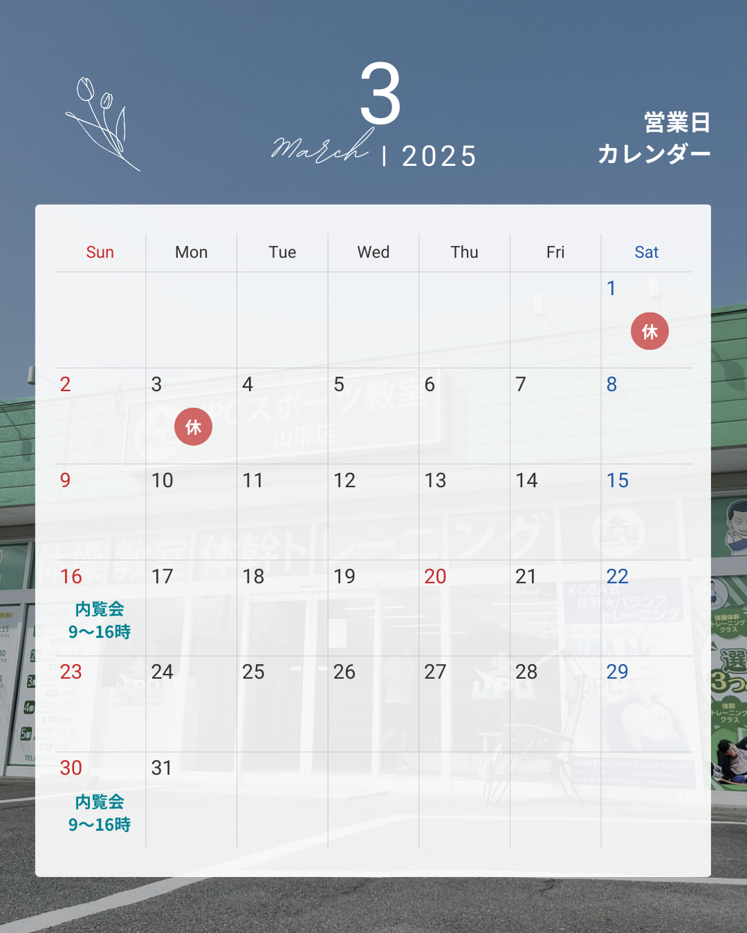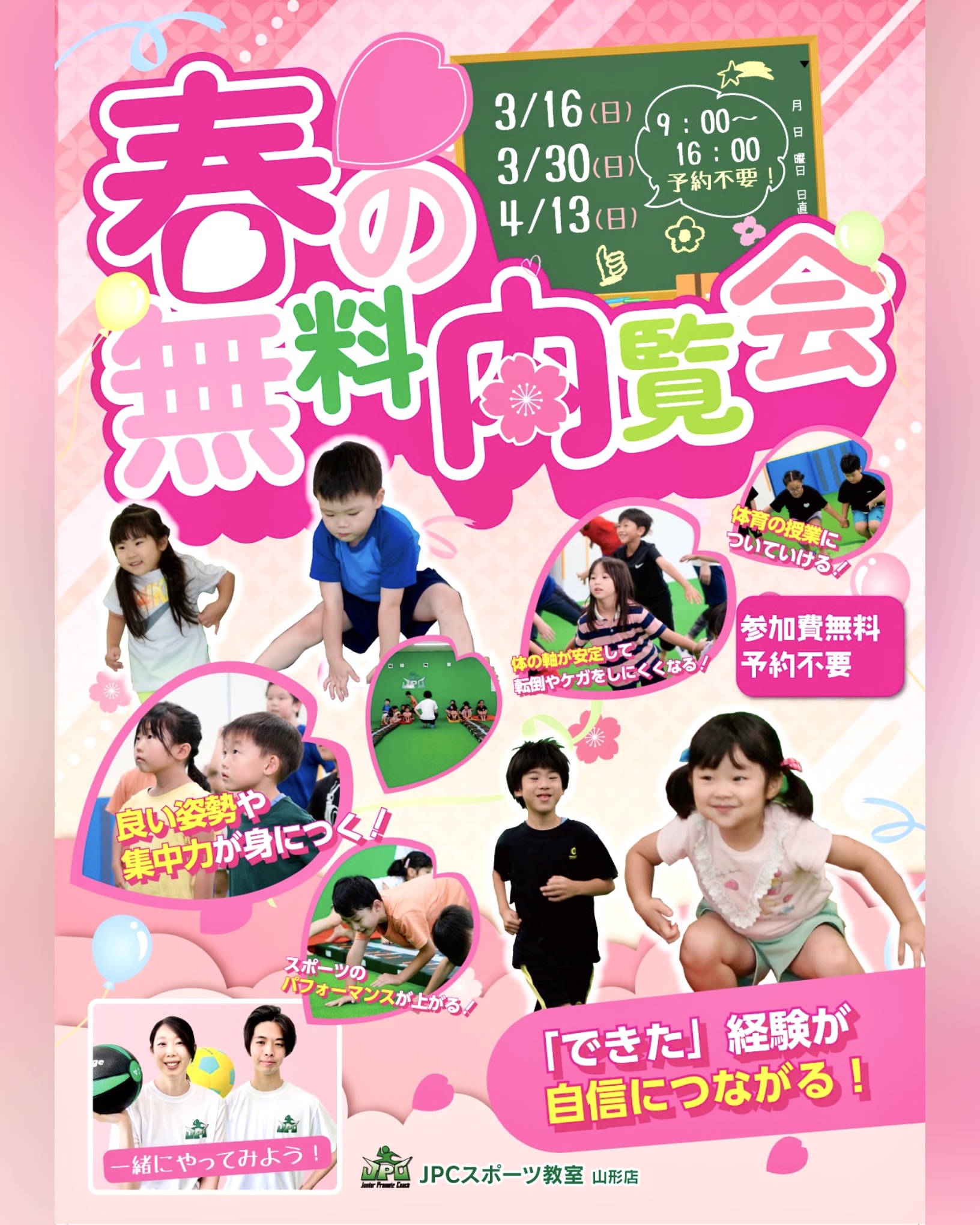 3月16日(日)、3月30日(日)、4月13日(日)JPCスポーツ教室山形店で春の内覧会を開催いたします🌸 ✅ご参加無料OK! ✅ご予約不要でOK! ✅ご見学だけでもOK! ✅運動のお悩み相談もOK!...