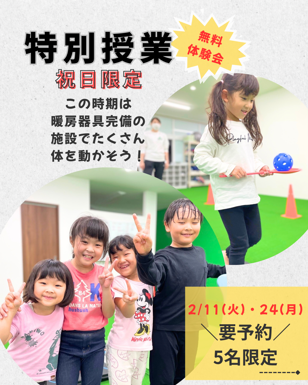 大好評! この度、2月の祝日に特別授業を開催します✨ \先着各5名・要予約/ *詳細* 日時:2月11日(火)・2月24日(月)1~3部 場所:JPC スポーツ教室山形店 料金:無料 年齢:3歳~小学...