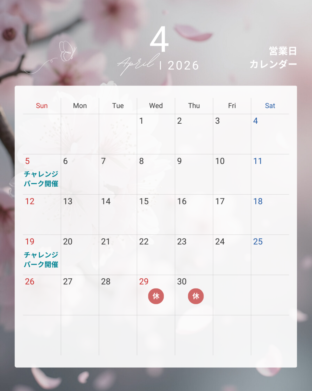 保存版4月営業日カレンダー🌸 JPCスポーツ教室山形店2026年4月の営業日のお知らせです📅 ⸻ 🎯注目ポイント ✔ 4/5(日)・4/19(日)👉 春の体幹チャレンジパーク開催🔥(楽しく運動能力を伸...