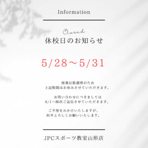JPCスポーツ教室(TOP) » 山形店 » お知らせ » 【休校日のお知らせ】