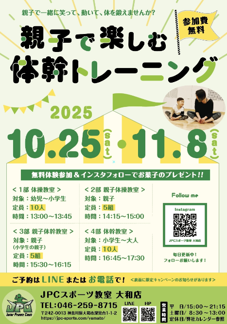 こんにちは!JPCスポーツ教室です。 最近、「うちの子、転びやすい」「姿勢が気になる」「スポーツがうまくならない」といったお悩みを持つ保護者の方が増えています。 実はそれ、「体幹の弱さ」が原因かもしれ...