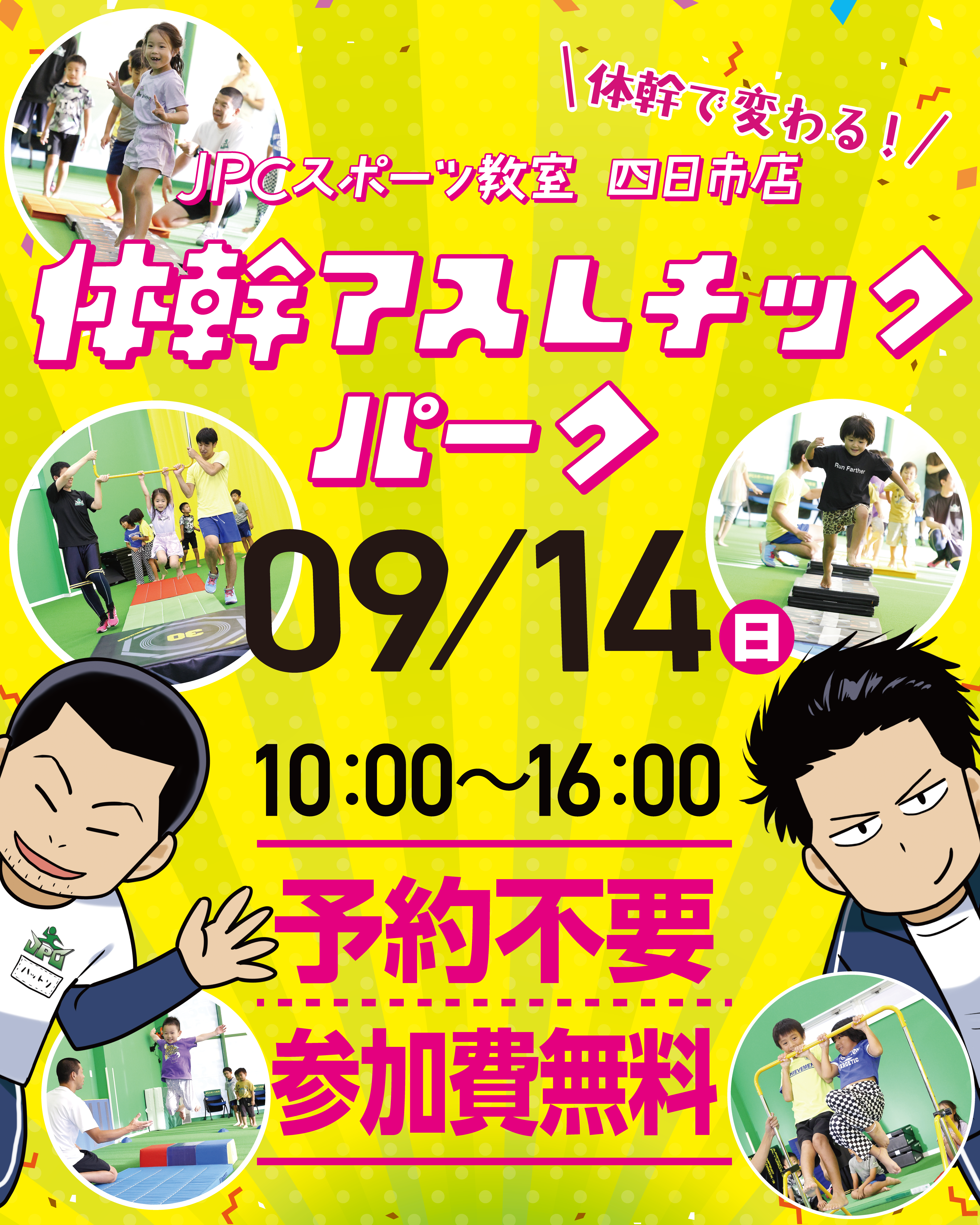 全国約100店舗・約2万人が通うJPCスポーツ教室四日市店 9月14日 体幹アスレチックパーク開催! 体幹アスレチックパークは参加費無料!どなたでも気軽に遊びに来てください♪ 体幹に特化した2歳半から...